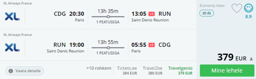 XL Airways pakub pakub hetkel väga hea hinnaga lennupileteid Pariisist Reunioni saarele. Edasi-tagasi lennupiletid on saadaval alates 379€ eest. Saadaval on ohtralt soodsaid lennukuupäevi veebruarist aprillini.