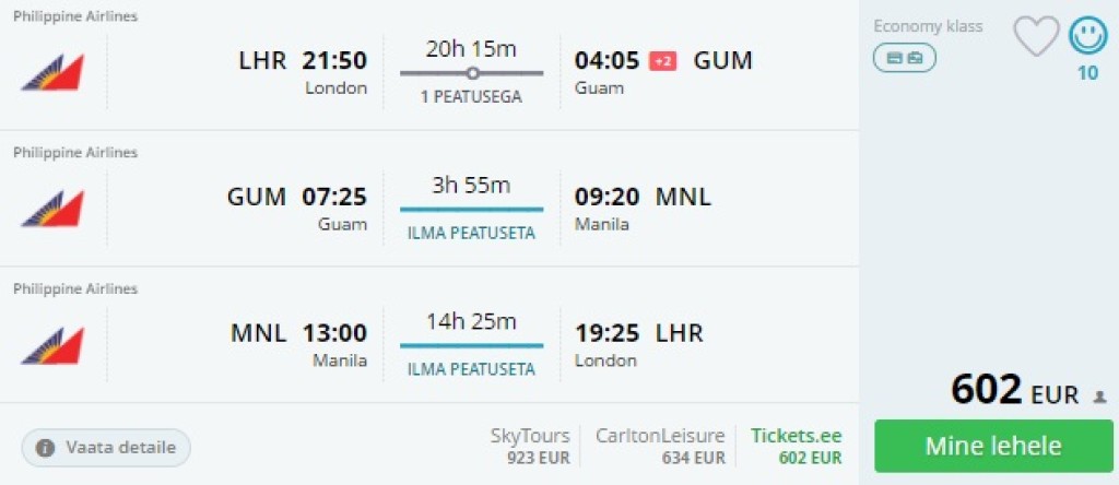 Lisaks eilsele pakkumisele: Lennupiletid Londonist Paapua Uus-Guineasse al 567€ toome teieni ka haruldaselt soodsad lennupiletid Philippine Airlinesiga Londonist Mikroneesiasse, Guami saarele. Soodsaid (al 574€) lennukuupäevi leidub veebruaris- märtsis. Saadaval nii edasi- tagasi lennupiletid, kui ka multi- city lennupiletid, mille puhul võid veeta osa reisist Filipiinidel.