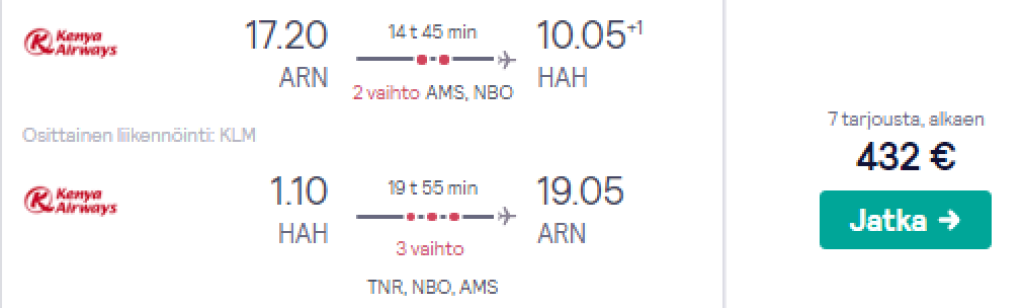 Kenya Airways pakub hetkel hea hinnaga lennupileteid Komoori saartele. Edasi-tagasi lennupiletid Stockholmist Moronisse on saadaval alates 432€ eest ning saadaval soodsad lennupiletid märtsiks. Parima hinnaga lennupiletid leiad üles allpool olevast kuupäevavalikust või otsides lennupileteid läbi skyscanneri. Soetades sinna juurde ajaliselt sobivad otselennud LOT'iga Tallinnast Stockholmi (al 70€), võid lennata Tallinnast Komoori saartele alates 502€ eest.