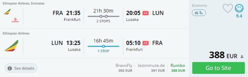 Ethiopian Airlines pakub hea hinnaga lennupileteid Frankfurdist Sambia pealinna Lusakasse. Pileteid hinnaga al 388€ on saada alates jaanuarist kuni maini 2017. a. Sellise hinnaga piletid on kõige paremini leitavad, kui vaadata väljumisi Frankfurdist neljapäeval ja tagasilendu laupäeval. Saadaval on ka veidi odavamaid lende, kuid sel juhul kaasneb pikk ümberistumine Addis Abeba Bole lennujaamas.