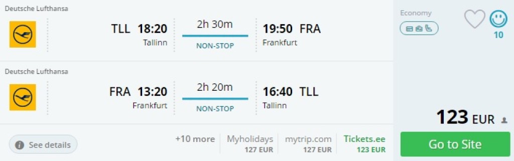 Edasi-tagasi lennupiletid Tallinnast Frankfurti on paljudel kuupäevadel saadaval hinnaga 123€.