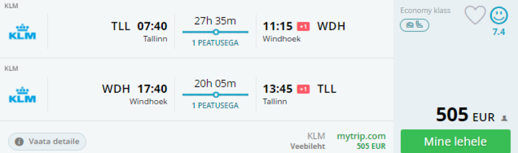 KLM pakub hetkel väga hea hinnaga lennupileteid Tallinnast Namiibiasse. Edasi-tagasi lennupiletid on saadaval alates 499€ eest.