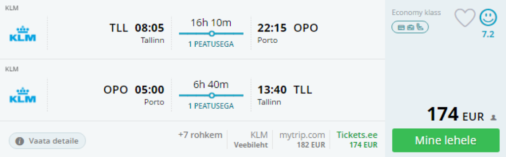 Hetkel on leitavad soodsad lennupiletid KLM'iga oktoobris Tallinnast Portosse. Valiku soodsaid lennukuupäevi leiad oktoobris hinnaga al 174€. Reeglina on boonuseks minnes pikem peatus Amsterdamis, mis on suurepärane võimalus linnaga tutvumiseks (ööbimine pole vajalik). Soodsad lennupiletid leiad läbi momondo või kasuta otselinke allpool.