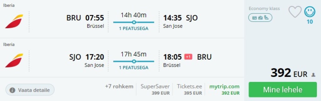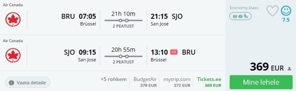 Mitmed erinevad lennufirmad pakuvad praegu soodsa hinnaga lende Brüsselist Costa Rica pealinna San Josesse. Piletitel on üsna hea saadavus alates 2017. a. septembrist 2018. aastasse välja. Tasub tähele panna, et kõige odavama hinnaga lend ei pruugi olla kõige kiiremate ümberistumistega. Minimaalselt kallimad piletid võivad kokku hoida küllalt palju aega. Allpool on välja toodud kuupäevad, kus ümberistumiste ajad on üsna kiired. Costa Rica on Eesti kodanikele viisavaba kuni 90 päeva.