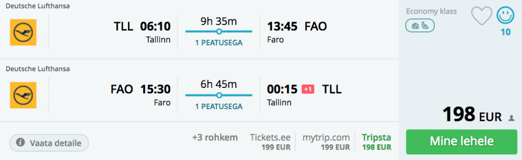 Lufthansa pakub hetkel soodsa hinnaga lennupileteid Tallinnast Lõuna-Portugali, Farosse. Edasi-tagasi lennupiletid Tallinnast Farosse on saadaval alates 198€ eest ning hea hinnaga lennupiletite saadavust leiab kuni juulini. Lennud on ühe ümberistumisega Frankfurdi lennujaamas. Parima hinnaga lennupiletid endale sobivatel lennukuupäevadel leiad üles läbi Momondo.ee .