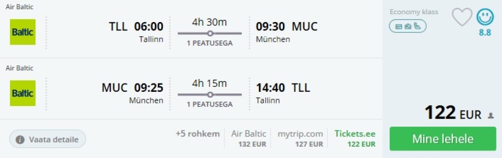 AirBaltic pakub oktoobris lennupileteid Tallinnast Münchenisse hinnaga 122€. Lennud on üle Riia, tähele tasub panna ümberistumise pikkust. Ära jõuab käia ka Oktoberfestil, mis sel aastal kestab kuni 4. oktoobrini.