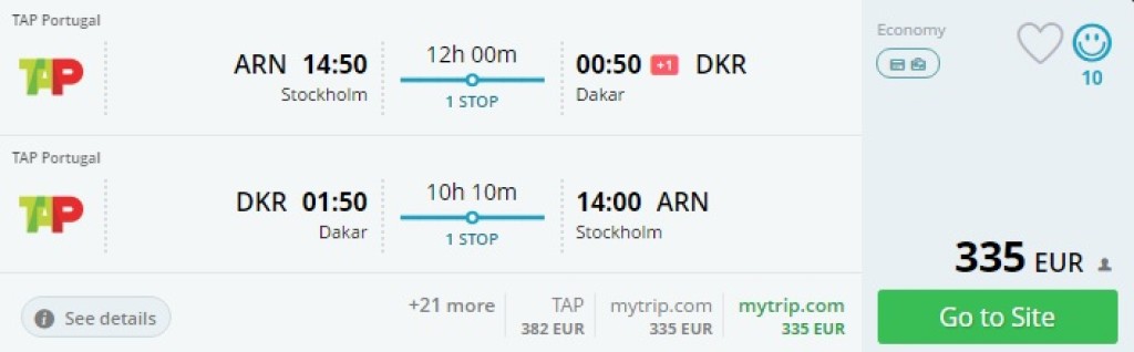 Portugali lennufirma TAP Portugal pakub erinevatest Euroopa linnadest soodsaid pileteid Senegali pealinna Dakari. Parima hinnaga piletid leiab algusega Luxemburgist ja Frankfurdist, kuid nende lendude miinuseks on tagasilennul pikem vahemaandumine Lissabonis. Veidi kallimad, kuid samas paremate lennuaegadega piletid leiab algusega Stockholmist. Müügis on lennud septembrist veebruarini.