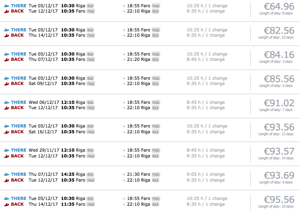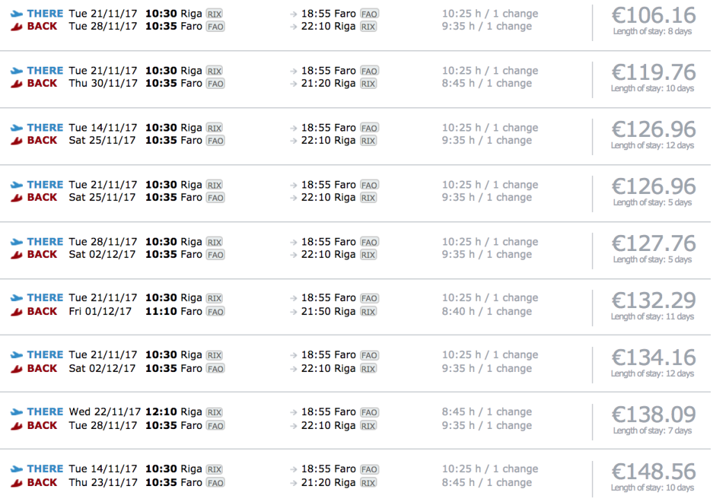 Kombineerides erinevate odavlennufirmade lende, saab edasi-tagasi lennupiletid Riiast Lõuna-Portugali Algarvesse kätte alates 65€ eest. Lendudel on 1 ümberistumine ning lennufirmadeks erinevad odavlennufirmad. Odavaima hinna sees ainult käsipagas aga alati saab pagasi juurde tellida. Otsisime välja ka väga hea hotellipakkumise läbi HotelsCombined.ee otsingumootori ning nädalase puhkuse (lennupiletid+hotell) saab kätte vaid 188€ eest.