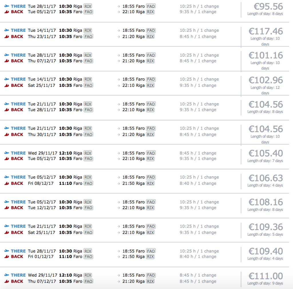 Kombineerides erinevate odavlennufirmade lende, saab edasi-tagasi lennupiletid Riiast Lõuna-Portugali Algarvesse kätte alates 96€ eest. Lendudel on 1 ümberistumine ning lennufirmadeks erinevad odavlennufirmad. Odavaima hinna sees ainult käsipagas aga alati saab pagasi juurde tellida. Otsisime välja ka väga hea hotellipakkumise läbi HotelsCombined.ee otsingumootori ning nädalase puhkuse (lennupiletid+hotell) saab kätte vaid 219€ eest.