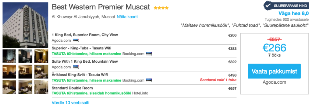 Näiteks võib leida Muscatis hotellitoa väga hea reitinguga Best Western Premier Muscat hotellis nädalaks ajaks hinnaga 266€. Lisainfo ja broneerimine