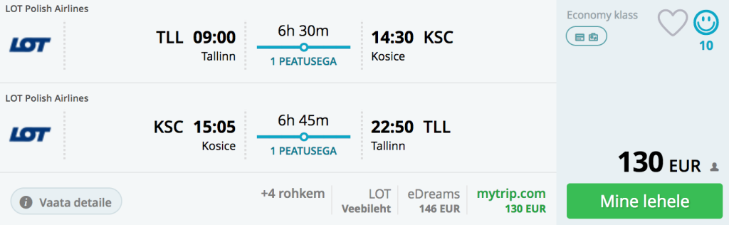 LOT koostöös Nordicaga pakuvad hetkel väga hea hinnaga lennupileteid suveks ning sügiseks Tallinnast Slovakkia suuruselt teise linna Košicesse. Edasi-tagasi lennupiletite hinnad on alates 130€. Meie poolt välja otsitud lennupiletid on mõlemal suunal ühe kiire ümberistumisega Varssavi lennujaamas. Parima hinnaga lennupiletid leiab üles otsides läbi Momondo