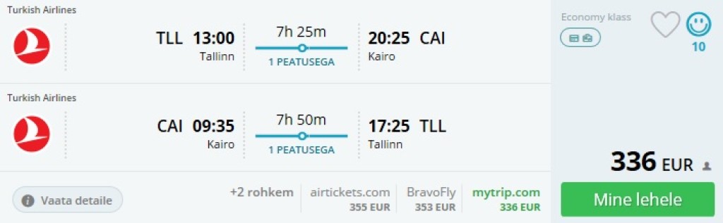 Turkish Airlines pakub lennupileteid Tallinnast Kairosse hinnaga 336 - 337€. Saadavust on alates septembri algusest kuni 2018. a. märtsi keskpaigani. v.a. aastavahetus. Lennud on ühe ümberistumisega Istanbulis, mille pikkus võib eri päevadel olla erinev, kuid küllalt hästi on saadaval ka alla 2 h ümberistumistega lennud (mõlemas suunas). Pikemate ümberistumiste korral tasuta öömaja Turkish Airlinesi poolt ei saa, kuna Istanbul – Kairo vahel toimub mitmeid lende, mis tähendab, et lennuplaanist tulenev ümberistumise vältimatu pikkus jääb alati alla 10 h.
