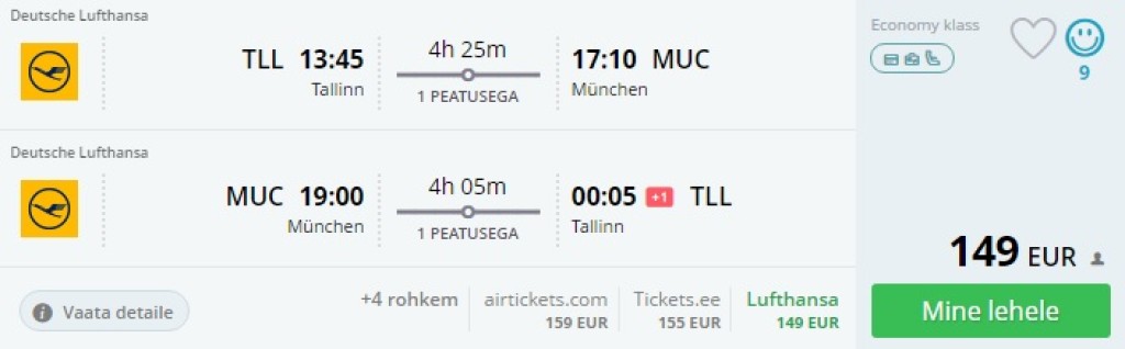 Hetkel pakuvad nii AirBaltic kui Lufthansa sarnase hinnaga lennupileteid Tallinnast Münchenisse. Mõlema lennufirma puhul on saadaval kiirete ümberistumistega lennud, kuid Lufthansal on võimalike lennuaegade valik loomulikult suurem. AirBalticu piletid maksavad paljudel päevadel 142€/147€, Lufthansa omad 149€. Pileteid on ohtralt saada kevadel ja veidi väiksemas valikus terve suvi läbi. Lisaks eelpoolmainitutele lendab Tallinnast Münchenisse ka Nordica. Odavaim leitud hind oli 202€, kuid see-eest kuulub hinna sisse ka ärantav pagas.