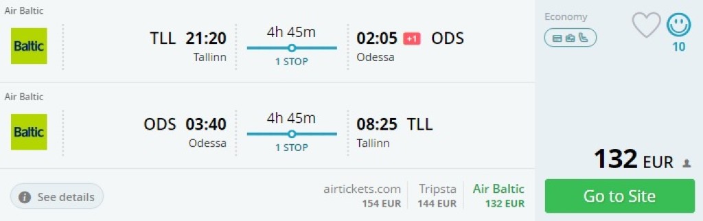AirBaltic pakub kevadel pileteid Tallinnast Odessasse hinnaga al. 132€. Enamik lende on kiirete ümberistumistega Riias. Kevadel toimuvad lennud 2x nädalas, Odessa suunal reedeti ja pühapäeviti, tagasi laupäeval ja esmaspäeval. Juunis lisandub ka teisipäevane/kolmapäevane lend. Toodud hinnad on lendamiseks käsipagasiga.