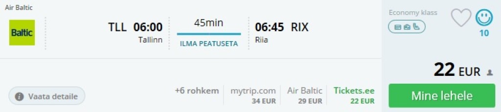 AirBaltic pakub soodsaid pileteid lendudele Tallinnast Riiga. Parima hinnaga piletid leiab, kui broneerida kumbki suund eraldi. Tallinn – Riia lennud on alates augustist saadaval hinnaga 22€ ja Riia – Tallinn alates septembri lõpust hinnaga 15€. Broneerides edasi-tagasi piletid, maksab pilet enamasti 50-51€, kuigi on leitavad ka piletid 39€.