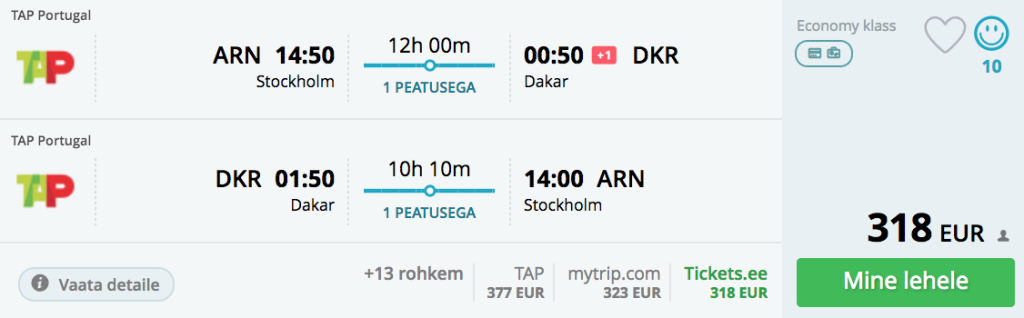 TAP Portugal pakub hetkel väga hea hinnaga lennupileteid Stockholmist Senegali pealinna Dakari. Edasi-tagasi lennupiletid Stockholmist Dakari on saadaval alates 318€ eest. Soodsa hinnaga lennupileteid leidub alates jaanuarist kuni juunini välja. Veebruaris ning märtsis on piletite hinnad paarkümmend eurot kallimad. Lennud on ühe ümberistumisega Lissabonis.