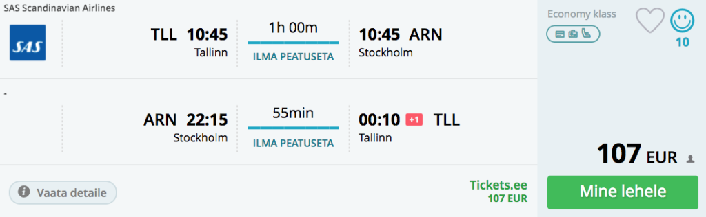 Tallinn-Stockholm-Tallinn 107€Hetkel leiab soodsad piletid üles SASi ning Nordicaga. Samas soovitame oodata mõnda Nordica müüki ning saad lennupiletid 100€-ga ja hinna sees on ka pagas.