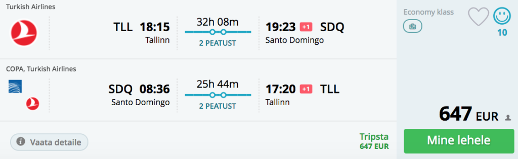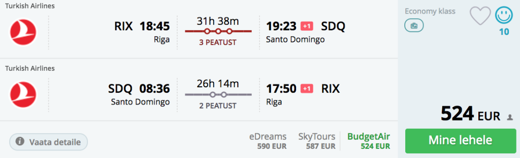 Turkish Airlines pakub koostöös Avianca ning Copaga lennupileteid Riiast Dominikaani Vabariiki, Santo Domingosse hinnaga alates 524€. Soodsa hinnaga lennupileteid leidub alates juunist kuni juulini ning alates septembrist kuni detsembrini (k.a jõulud ja aastavahetus!). Lendudel on ümberistumised nii Istanbulis kui Panama Citys või Bogotas. Ümberistumiste pikkused on 3-5h. Piletiteni jõudmiseks kliki näidiskuupäevadel allpool või kontrolli endale sobivaid lennukuupäevi läbi momondo
