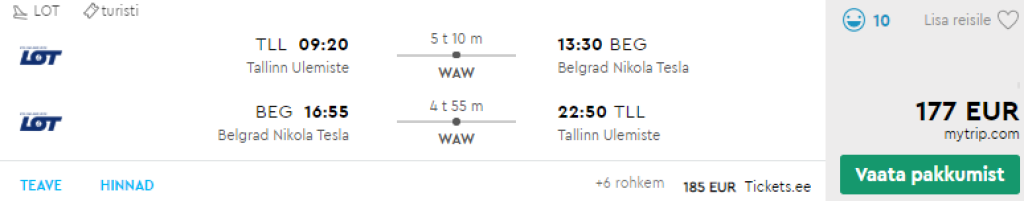 LOT pakub hetkel hea hinnaga lennupileteid Tallinnast Belgradi. Edasi-tagasi lennupiletid veetmaks pikk nädalavahetus Belgradis leiab üles alates 177€ eest ja hea hinnaga lennupileteid leidub alates novembrist kuni 2020 aasta märtsini. Lennud on mõlemal suunal ühe ümberistumisega Varssavi lennujaamas. Lennupiletite ostmiseks kliki allpool olevatel näidiskuupäevadel, või otsi endale sobivad lennupiletid üles läbi momondo.