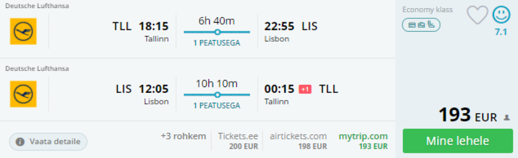 Hetkel on saadaval soodsad lennupiletid Lufthansaga kevadeks Tallinnast Portugali, Lissaboni! Edasi- tagasi lennupiletite hinnad al 193€. Soodsaid lennukuupäevi leiad märtsist kuni maini! Piletiteni jõudmiseks kasuta otselinke allpool või otsi lennupiletid üles läbi momondo.