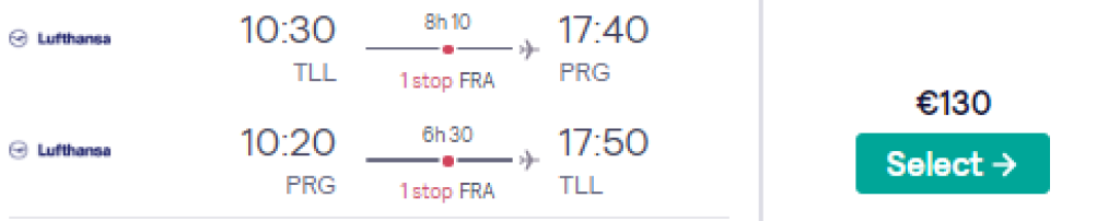 Lufthansa pakub hetkel soodsa hinnaga lennupileteid Prahasse. Edasi-tagasi lennupiletid Tallinnast on saadaval alates 130€. Soodsa hinnaga lennupileteid on saadaval juulist septembrini. Parima hinnaga lennupiletid leiad üles allpool olevast kuupäevavalikust või otsides endale sobivad lennupiletid üles läbi Skyscanneri.