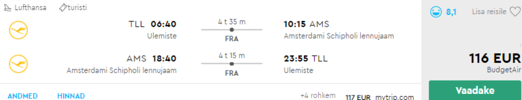 Lufthansa pakub hetkel soodsa hinnaga lennupileteid Tallinnast Amsterdami. Edasi-tagasi lennupiletid veetmaks pikk nädalavahetus Amsterdamis on saadaval 116€ eest ning soodsa hinnaga lennupileteid on saadaval novembrist kuni aprillini välja. Lendudel on mõlemal suunal üks kiire ümberistumine Frankfurdis. Piletiteni jõudmiseks kasuta otselinke allpool või otsi lennupiletid üles läbi Momondo.ee
