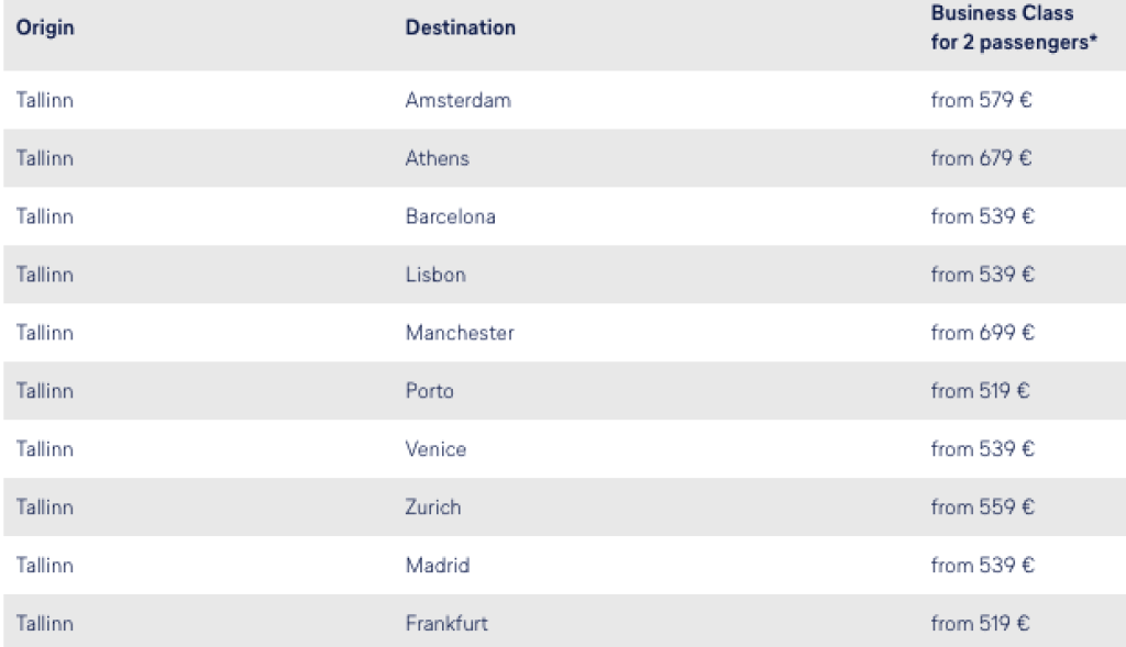 Näited äriklassi lennupiletitele algusega Tallinnast (hinnad on kahele inimesele):