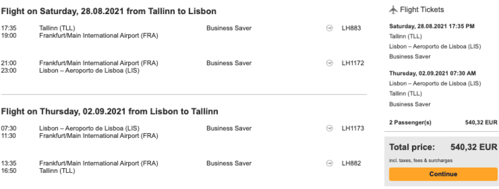 Tallinn-Lissabon-Tallinn 540€ ehk 270€/per person