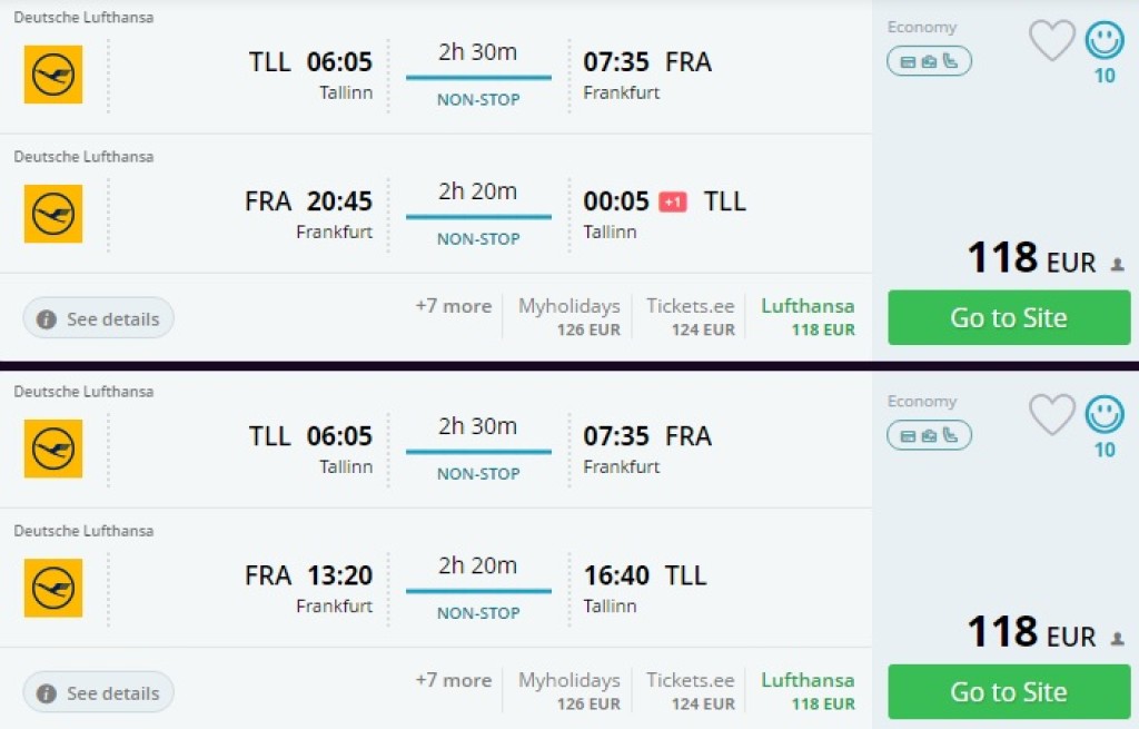Lufthansa pakub edasi-tagasi otselende Tallinnast Frankfurti hinnaga 118€. Sellise hinnaga pileteid on saada osadel kuupäevadel novembris 2016 ja jaanuaris 2017. Alates veebruarist paraneb saadavus märgatavalt ning on suurepärane aprillist kuni septembri lõpuni, v.a. juuli teine pool. Enamikel päevadel on võimalik valida mitme lennu vahel.