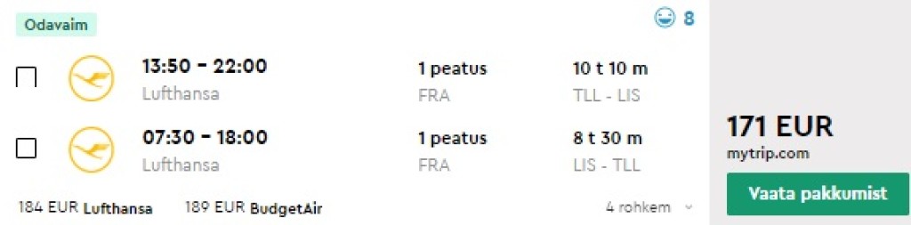 Euroopa parim lennufirma Lufthansa pakub hetkel soodsaid edasi-tagasi lennupileteid Tallinnast Lissaboni alates 171€ eest. Saadavust leiab alates jaanuari keskpaigast kuni maini ning lendudel on mõlemal suunal üks ümberistumine Frankfurdis. Parima hinnaga lennupiletid leiad üles läbi Momondo.ee