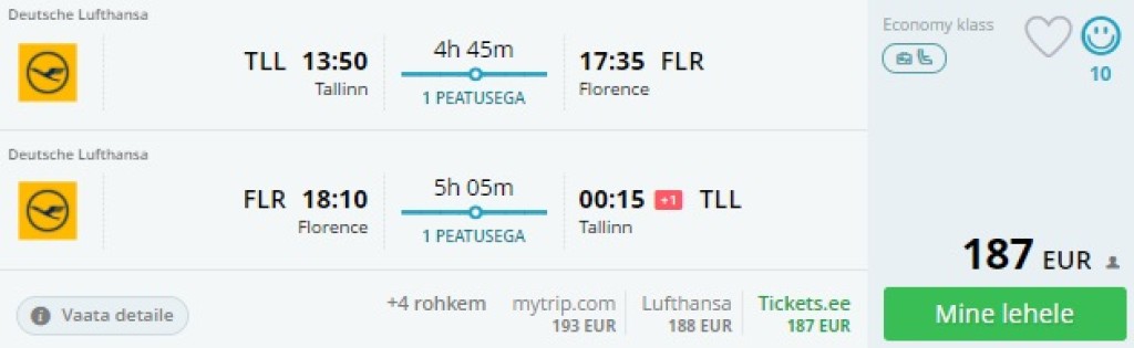 Teised lennukuupäevad leiad: [Edasi-tagasi lennupiletid Lufthansaga suvel Tallinnast Toskaanasse 188€](https://trip.ee/odavad-lennupiletid/edasi-tagasi-lennupiletid-lufthansaga-suvel-tallinnast-toskaanasse-188)
