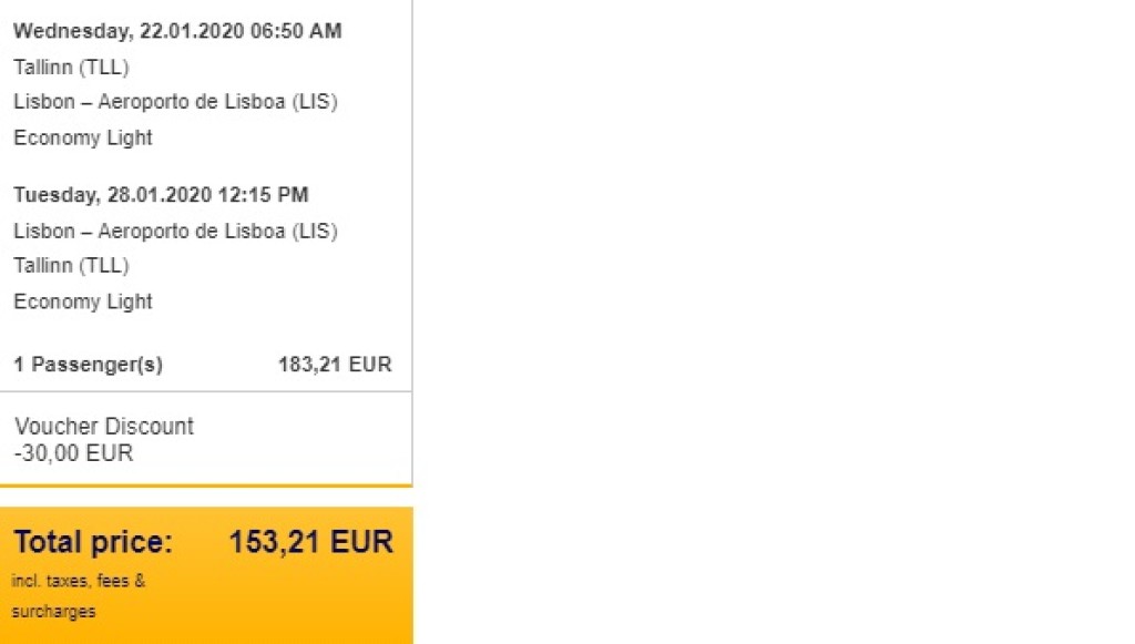 Parima hinnaga lennupiletite ostmiseks sisesta sooduskood ZKKECR51TUEJ Lufthansa kodulehel broneeringu lõpuosas. Valiku varemväljatoodud lennukuupäevadest Tallinnast Lissaboni leiad pakkumisest edasi-tagasi lennupiletid Lufthansaga Tallinnast Lissaboni alates 173€