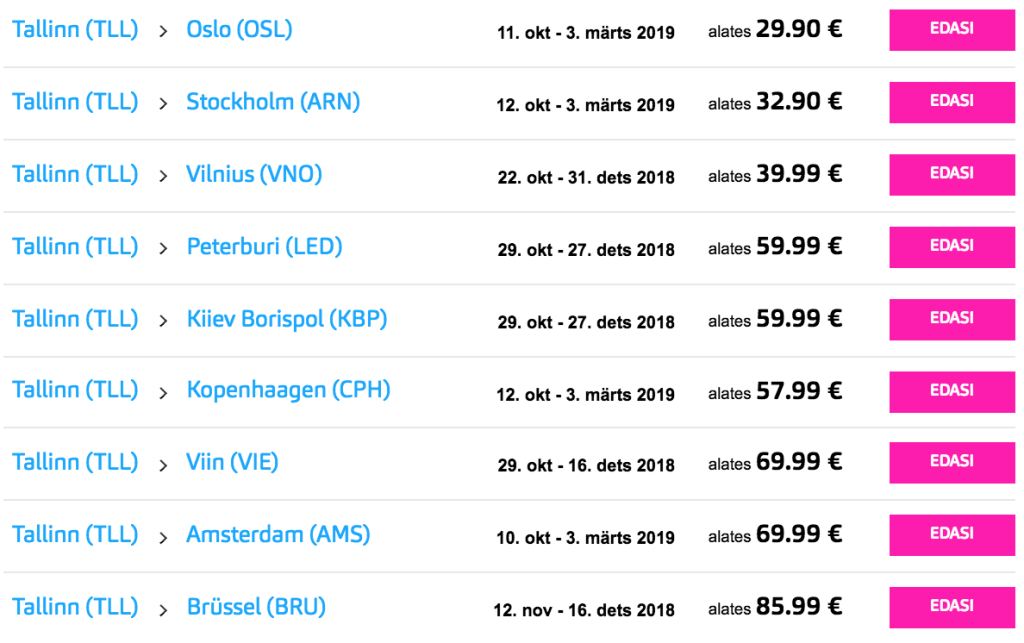 Ühe suuna kampaaniahindade näited: