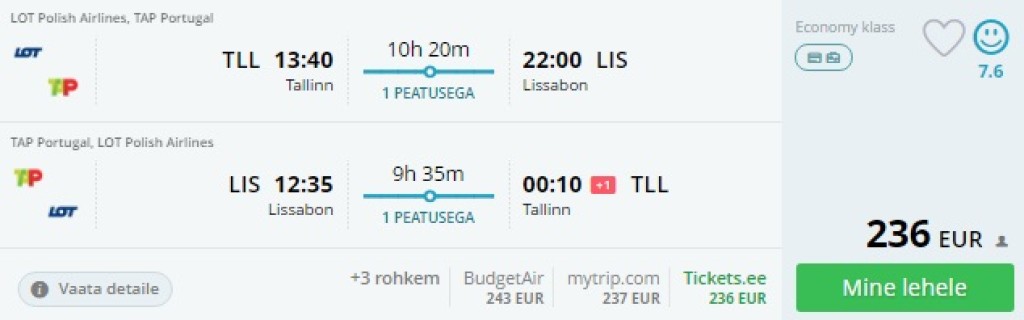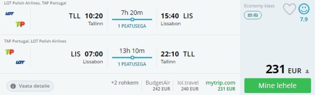 Magus pakkumine nendele tripikatele, kes otsivad lennupileteid kohe ja praegu Lõuna- Euroopasse lendamiseks!Hetkel on saadaval edasi- tagasi lennupiletid **oktoobrikuuks** **Tallinnast** Portugali pealinna, **Lissaboni**. Edasi-tagasi lennupiletid on saadaval vaid alates **231€** eest. Lennud on ühe ümberistumisega mõlemal suunal. Soodsad piletid leiad üles läbi allolevate otselinkide või kontrolli endale sobivaid lennukuupäevi läbi [Momondo](http://tc.tradetracker.net/?c=23368&m=12&a=258453&u=https%3A%2F%2Fwww.momondo.ee%2Fflightsearch%2F%3FSearch%3Dtrue%26TripType%3D2%26SegNo%3D2%26SO0%3DHEL%26SD0%3DMEL%26SDP0%3D12-01-2018%26SO1%3DMEL%26SD1%3DHEL%26SDP1%3D25-01-2018%26AD%3D1%26TK%3DECO%26DO%3Dfalse%26NA%3Dfalse%26currency%3DEUR).ReisikindlustusReisikindlustusega oled reisiüllatusteks alati valmis. Sõlmi leping PZU e-poes ja saad kuni 15% soodustust!