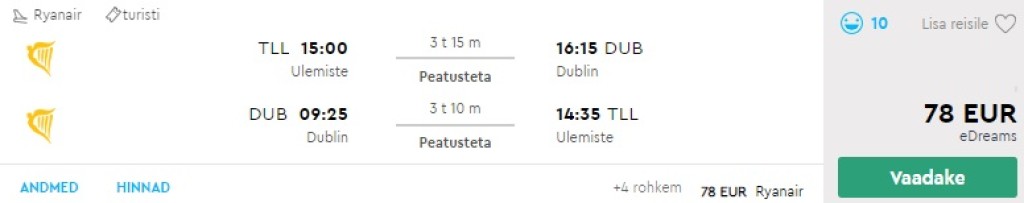 Iiri odavlennufirma Ryanair pakub hetkel hea hinnaga lennupileteid aprillis-mais Tallinnast Iirimaa pealinna Dublinisse. Edasi-tagasi lennupiletid on saadaval alates 78€ eest. Tegemist on otselendudega. Piletiteni jõudmiseks kliki allpool olevatel näidiskuupäevadel või kontrolli endale sobivaid lennukuupäevi läbi Momondo.ee