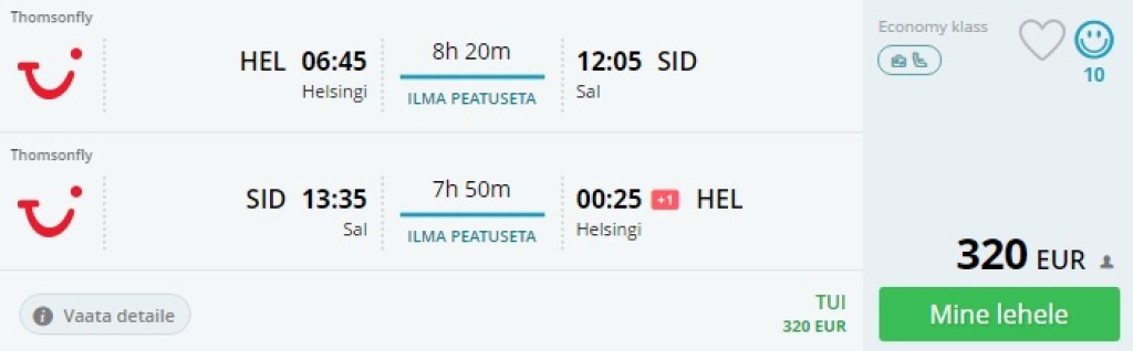 Soome reisikorraldaja TUI (endine Finnmatkat) pakub novembris hea hinnaga otselendude pileteid esmaspäevastele väljumistele Helsingist Roheneemesaarte kõige põhjapoolsemale saarele Sali. ReisikindlustusReisikindlustusega oled reisiüllatusteks alati valmis. Sõlmi leping PZU e-poes ja saad kuni 15% soodustust!