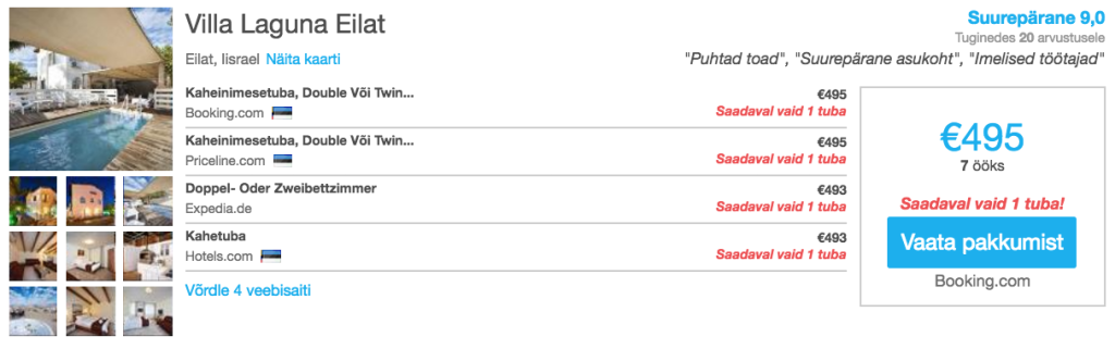 Meie soovitused:Villa Laguna Eilat - Tuba kahele väga hea reitinguga hotellis maksab nädalaks ajaks 495€ ehk 248€/per person. Tripadvisoris on selle hotelli reitinguks 4.5/5. Vaata pakkumist siit