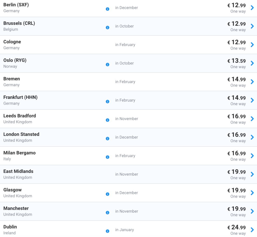 Ryanair pakub kuni pühapäevani 2 miljonit soodsat lennupiletit. Kõikidel lendudel on hinnad soodsamad kuni -20%. Lennuperiood on 11. oktoober – 31. jaanuar 2017. Soodustused kehtivad ka lendudele Tallinnast ja Riiast. Toome allpool välja ka mõned edasi-tagasi lennupiletite hinnanäited.