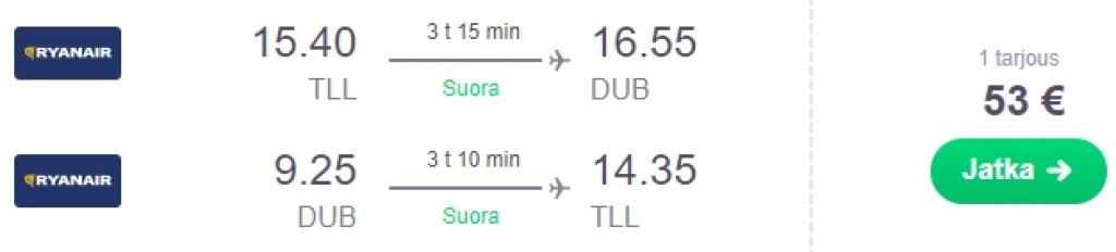 Iiri odavlennufirma Ryanair pakub hetkel hea hinnaga otselende Tallinnast Iirimaale, Dublinisse! Edasi-tagasi lennupiletid on saadaval alates 53€ eest. Saadaval hea valik soodsaid lennukuupäevi aprillist juunini. Parima hinnaga lennupiletid leiad lihtsasti üles läbi skyscanneri või klikkides allpool olevaltel näidiskuupäevadel. Tõime välja valiku alla 100-eurostest lennukuupäevadest.