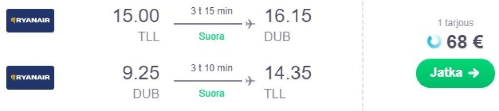 Iiri odavlennufirma Ryanair pakub hetkel hea hinnaga otselende Tallinnast Iirimaale, Dublinisse! Edasi-tagasi lennupiletid on saadaval alates 68€ eest. Saadaval hea valik soodsaid lennukuupäevi aprillist juunini. Parima hinnaga lennupiletid leiad lihtsasti üles läbi skyscanneri või klikkides allpool olevaltel näidiskuupäevadel.