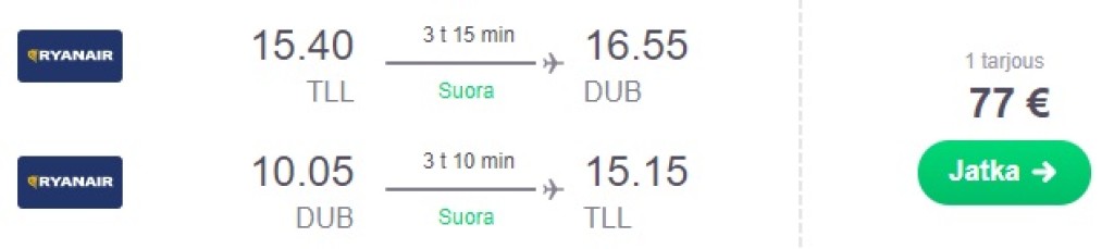 Iiri odavlennufirma Ryanair pakub hetkel hea hinnaga otselende Tallinnast Iirimaale, Dublinisse! Edasi-tagasi lennupiletid on saadaval alates 77€ eest. Saadaval hea valik soodsaid lennukuupäevi aprillist juunini. Parima hinnaga lennupiletid leiad lihtsasti üles läbi skyscanneri või klikkides allpool olevaltel näidiskuupäevadel.