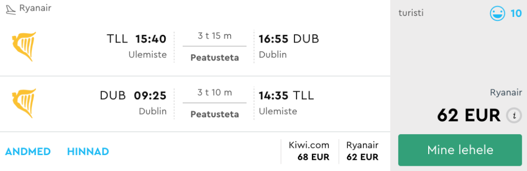 Iiri odavlennufirma Ryanair pakub hetkel väga hea hinnaga lennupileteid Tallinnast Iirimaale. Soodsaimad edasi-tagasi lennupiletid Tallinnast Dublinisse on saadaval alates 62€ eest. Tegemist on otselendudega. Piletiteni jõudmiseks kliki allpool olevatel näidiskuupäevadel või kontrolli endale sobivaid lennukuupäevi läbi Momondo.ee