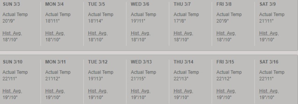 Algarve rannikul on päikeselisi päevi enam kui 300. päeval aastas ning selge taevas ning 15 soojakraadi ootavad sind suure tõenäosusega ees ka talvisel ajal. Näide õhutemperatuuridest märtsis 2019: