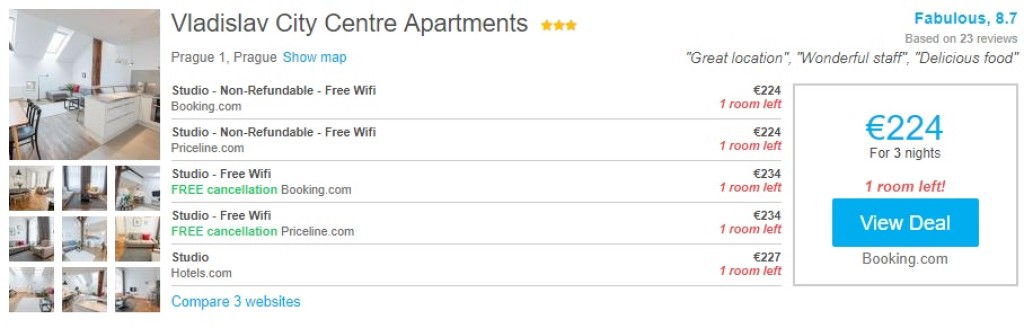 HotellidPrahas leidub hotelle igale maitsele ja rahakotile. Järgnevalt on välja toodud väga häid hinnanguid saanud majutuskoht Praha kesklinnas, kus kõik põhiline on jalutuskäigu kaugusel. Stuudiokorter kahele inimesele 3 ööks kuupäevadel 16.10-19.10 maksab 224€.