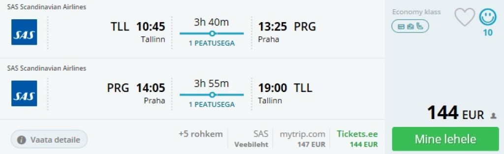 SAS pakub oktoobris lennupileteid Tallinnast Prahasse hinnaga 144€. Lennud on ühe lühikese vahemaandumisega Stockholmis.