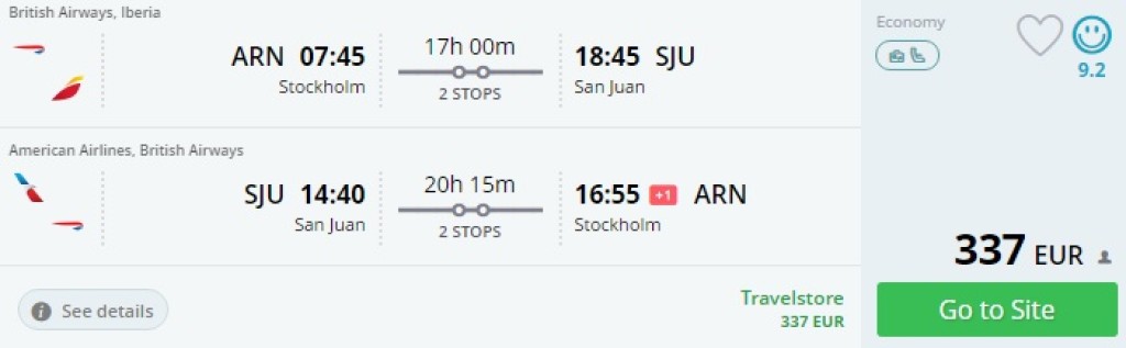 Lennundusalliannsi Oneworld kuuluvad lennufirmad Finnair, British Airways, Iberia ja American Airlines pakuvad soodsaid lende Stockholmist Puerto Ricosse San Juani. Lennumarsruudid võivad olla väga erinevad. Odavaimad piletid on sageli mõne pika ümberistumisega, kuid vaid paar eurot kallima piletiga leiab oluliselt kiiremad lennukombinatsioonid. Pileteid on saada lendudele perioodil august 2017 kuni veebruar 2018.