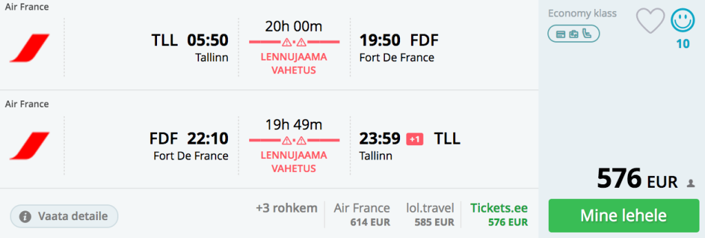 AirFrance koostöös airBalticuga pakuvad hetkel väga hea hinnaga lennupileteid prantsuskeelsele Martinique saarele. Lennud on kahe ümberistumisega, üks Riias ning teine Pariisis. Soodsad lennupiletid on saadaval jaanuarist kuni aprillini ning saadavus on suurepärane. Parima hinnaga lennupiletid leiad üles läbi Momondo
