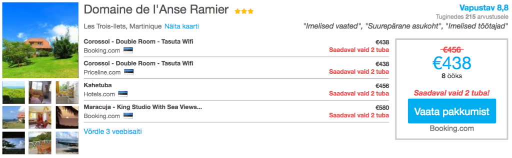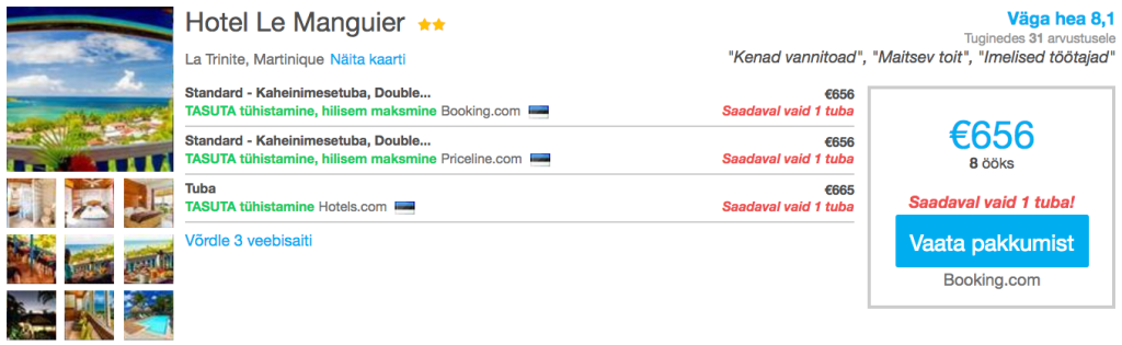 Majutussoovitused Martinique saarelOtsisime välja läbi hinnavõrdlusportaali HotelsCombined.ee mõned väga head pakkumised kaheksaks ööks just selles vahemikus.Domaine de l'Anse Ramier - Tuba kahele suurepärase reitinguga kolmetärnihotellis kaheksaks ööks maksab 438€. Otsi endale sobivad kuupäevad SIIT