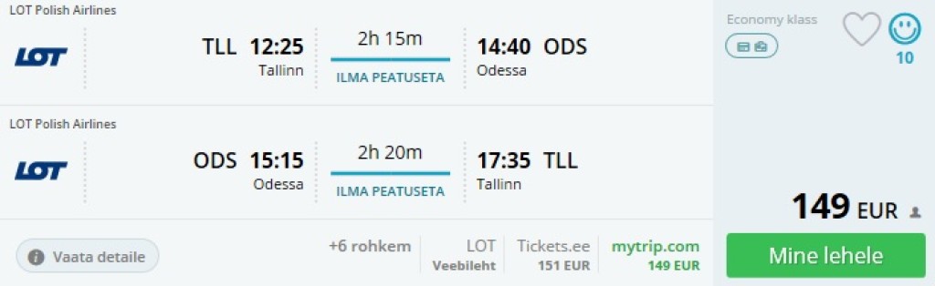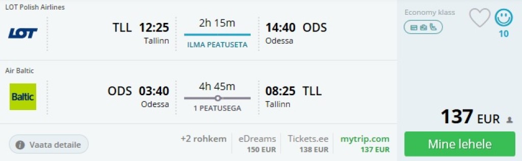 Nordica käimasoleva sooduskampaania raames on saadaval hooaja viimased otselennud Tallinnast Odessasse hinnaga 149€. Kombineerides Nordica ja AirBalticu lende, saab Odessasse lennata ka hinnaga 137€. Arvestada tuleb, et Nordical on piletihinnas ka äraantav pagas, AirBalticul ainult käsipagas ning Nordica pakub paremaid lennuaegu. Lennud toimuvad laupäeviti.