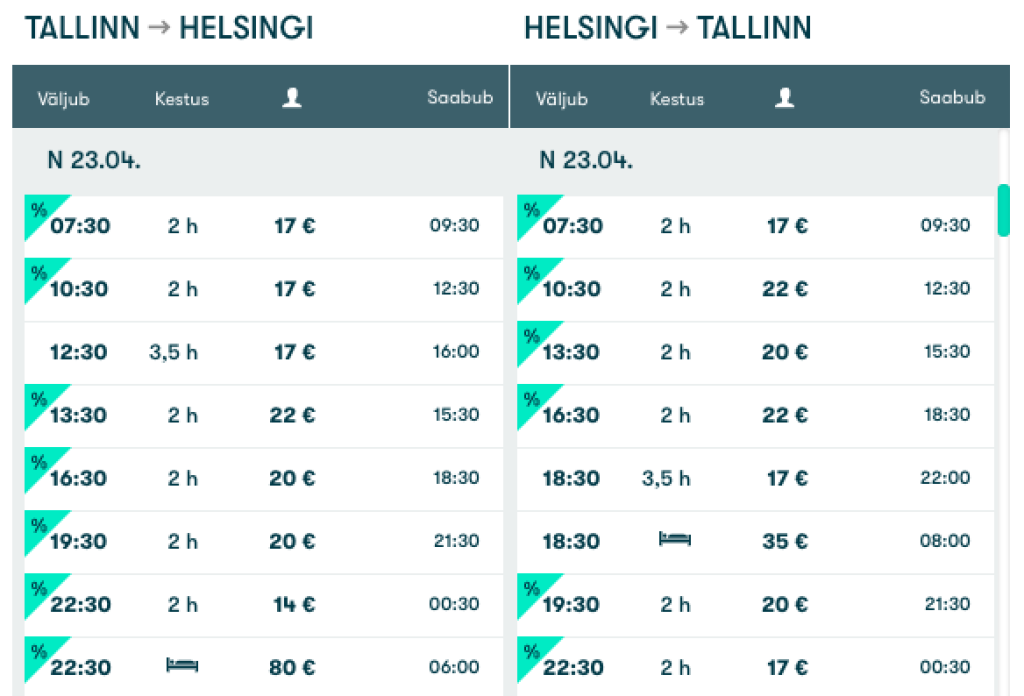 Tallinkil on hetkel käimas kampaania laevapiletitele Tallinnast Helsingisse, Ahvenamaale ja Stockholmi. Sooduskoodiga KEVAD saad osta pileti kuni 25% soodsamalt. Kui sul on Club One kaart, siis saad pakkumise veelgi soodsamalt. Kampaania kestab kuni 16.03 ning kampaaniahinnaga laevapiletid on saadaval reisimaks alates märtsist kuni mai lõpuni.